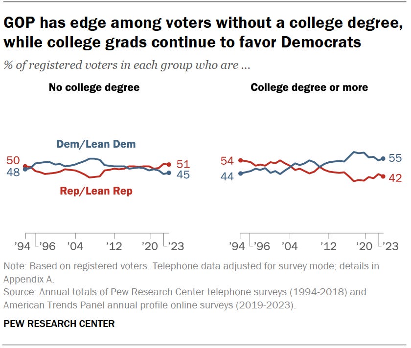 Identifying as a Democrat or Republican may depend on whether you have a college degree, or not. How might that drive public policy?